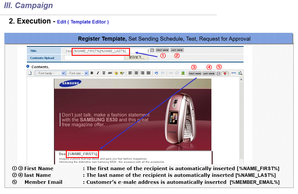 SAP CRM include the campaign tool but It has a week point of campaign design. Samsung developed in-house solution to manage email template easily , to analysis campaign result , to execute follow up campaign with integration of SAP CRM.